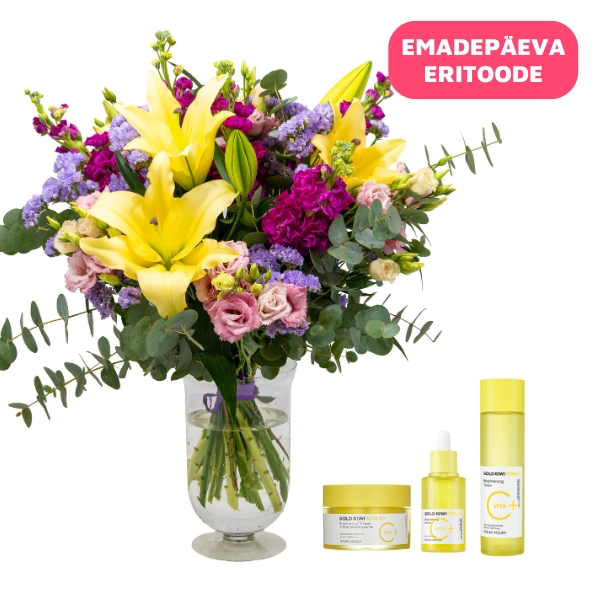 Emadepäeva lillekimp ja hoolduskomplekt, mis ühendab värske ja pilkupüüdva lillekimbu liiliate ja hooajaliste õitega ning kvaliteetse Holika Holika Gold Kiwi iluhooldustoodete komplekti. Elegantne ja läbimõeldud kingitus, mis sobib suurepäraselt emadepäevaks, tänuavalduseks või erilise tähelepanu väljendamiseks. Lillekimp toob igasse päeva värvi ja ilu, samas kui hoolduskomplekt lisab kingitusele praktilisust ja luksuslikku puudutust, luues tervikliku ja meeldejääva kingielamuse.