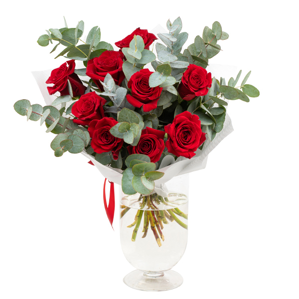 Võluvatest punastest roosidest ja trendikast eukalüptist koosnev lillekimp on kaunis lilleüllatus igalse saajale.