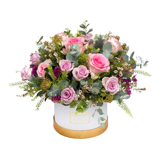 See idülliline lillekarp on kombineeritud kaunitest roosadest roosidest ja hooajalisest rohelisest, mis sobib kinkimiseks igaks tähtpäevaks.