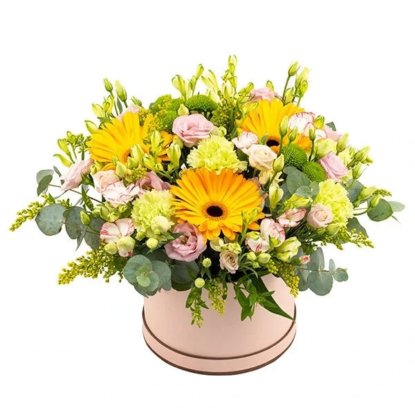 Imelistes kollastes toonides trendikas ja lopsakas lillekarp, mis vaimustab igat saajat. Karpi on seatud kauapüsivad kollased gerberad, imekaunid preeriakellukesed, trendikad nelgid ja vapustavad inkaliiliad. Viimase lihvi annab hooajaline kimburoheline.