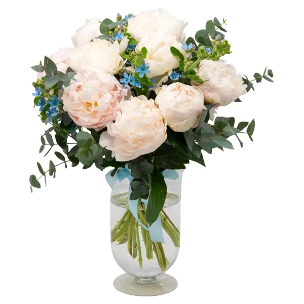 Hele pojengide lillekimp, milles on ühendatud õrnad kreemikad ja heleroosad pojengid koos värske kimburohelise ja väikeste lisalilledega. Lopsakas ja elegantne lillekimp kingituseks, mis sobib suurepäraselt sünnipäevaks, tänuavalduseks või erilise hetke tähistamiseks. Värsketest pojengidest valmistatud kimp, mis loob pehme ja romantilise meeleolu.