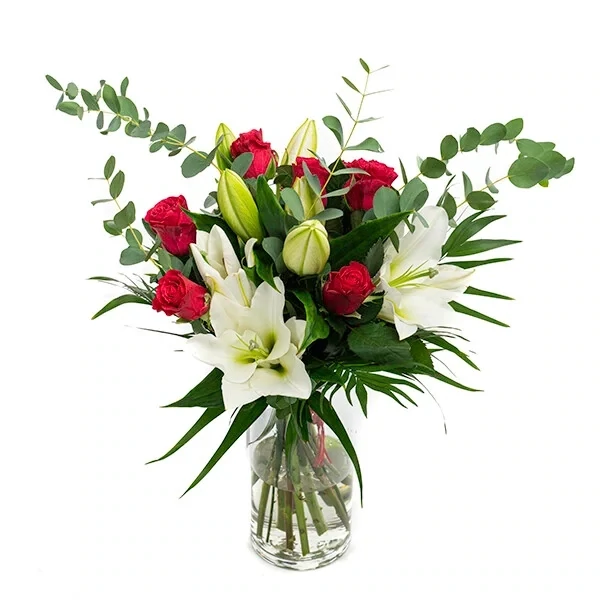 Selles kimbus on esindatud liiliate elegants ja rooside kuninglikkus, kooslust tasakaalustab ning soeb tervikuks sobivalt moodne kimburoheline - ideaalne valik igaks tähtpäevaks!