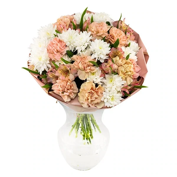 See kaunitest maaliliselt malbetes toonides lillekimp koosneb erivärvilistest roosatoonilistest nelkidest ja valgetest oksakrüsanteemidest.