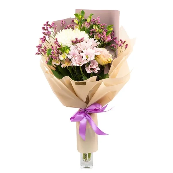 See heledatest malbetest toonidest koosnev imekaunis lillekimp on ideaalne kingitus igaks tähtpäevaks. Dekoratiivpaber ja pael annavad kimbule kauni raami.