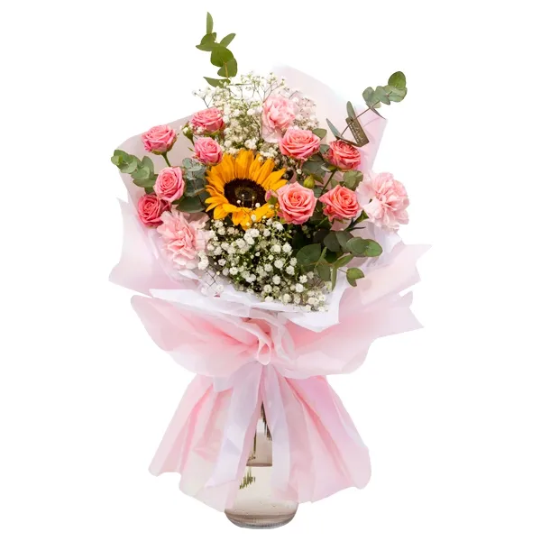 Päevalille ja rooside lillekimp, milles on ühendatud päikeseline kollane päevalill ja õrnad roosad roosid koos värske kimburohelisega. Rõõmus ja pilkupüüdev lillekimp kingituseks, mis sobib suurepäraselt sünnipäevaks, õnnitlemiseks või kellegi päeva säravamaks muutmiseks. Värsketest lilledest valmistatud kimp, mis toob igasse päeva soojust ja positiivset energiat.