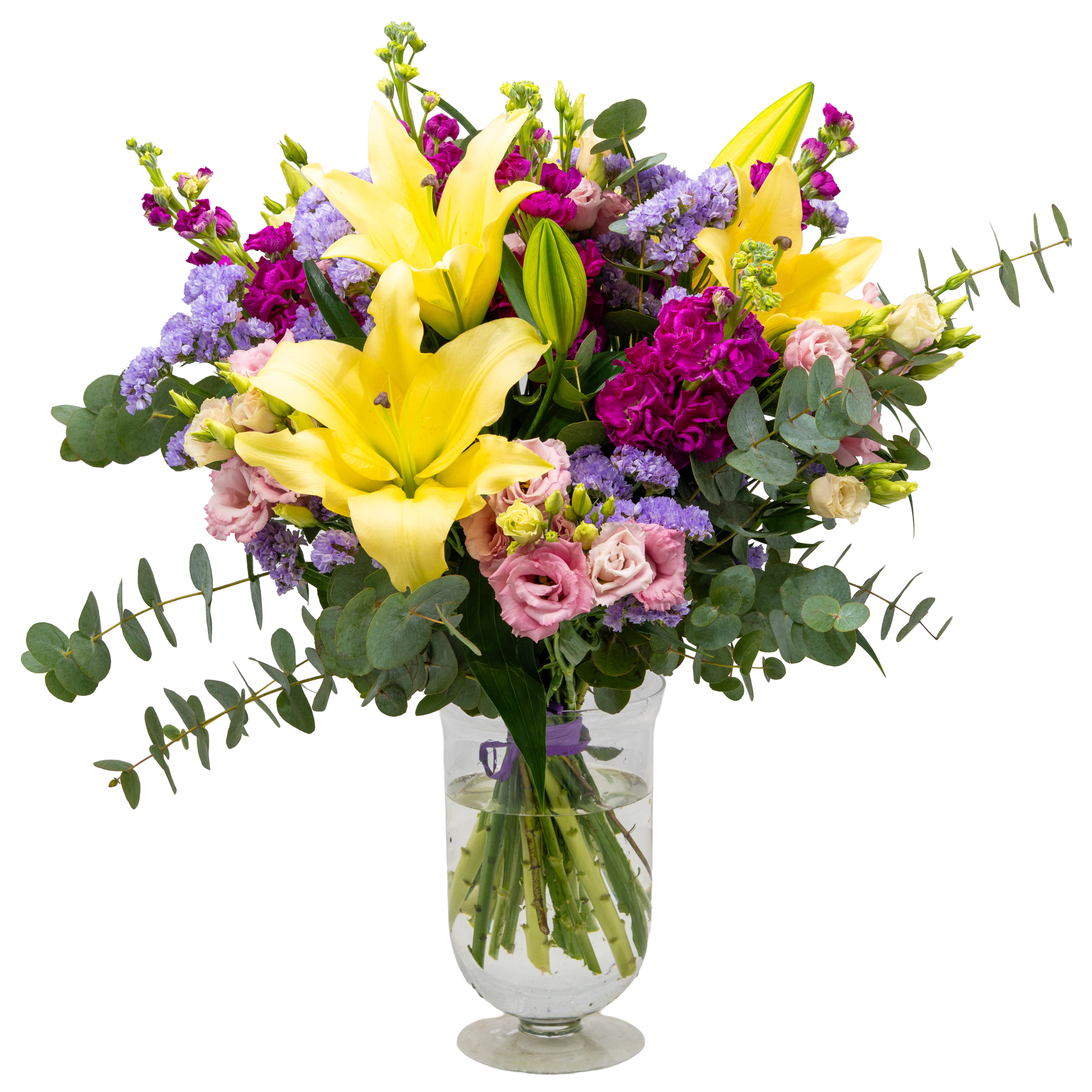 Pilkupüüdev lillekimp liiliatega, milles on ühendatud suursugused kollased liiliad, värvikad lisalilled ja värske kimburoheline. Silmapaistev ja elegantne lillekimp kingituseks, mis sobib suurepäraselt sünnipäevaks, tähtpäevaks või erilise üllatusena. Värsketest lilledest valmistatud kimp, mis toob igasse päeva luksuslikku ilu ja rõõmu.