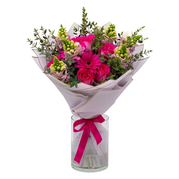 Rõõmus roosa lillekimp, milles on ühendatud erksad roosad õied, õrnad lisalilled ja värske kimburoheline. Silmapaistev ja energiline lillekimp kingituseks, mis sobib ideaalselt sünnipäevaks, õnnitlemiseks või kellegi päeva särama panemiseks. Värvikas lillekimp, mis toob kaasa positiivseid emotsioone ja rõõmu.