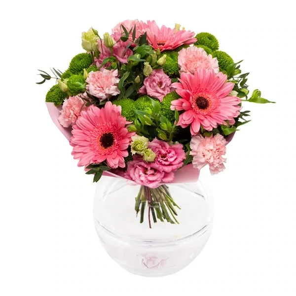 Kaunis, suur roosatooniline lillekimp on kokku seatud gerberatest, preeriakelladest, oksakrüsanteemidest ja nelkidest - moodustades rõõmsalt roosatoonilise terviku.