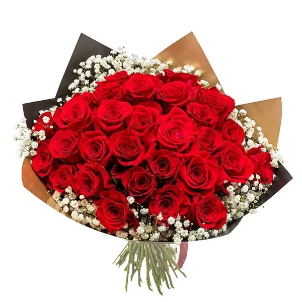 See romantiline punaste roosidega lillekimp on ümbritsetud õrna kimpslillega olles imeline ja meeldejääv kingitus kõige kallimale!