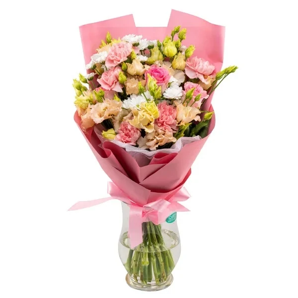 See roosadest malbetest toonidest koosnev imekaunis lillekimp on ideaalne kingitus igaks tähtpäevaks. Dekoratiivpaber ja pael annavad kimbule kauni raami.