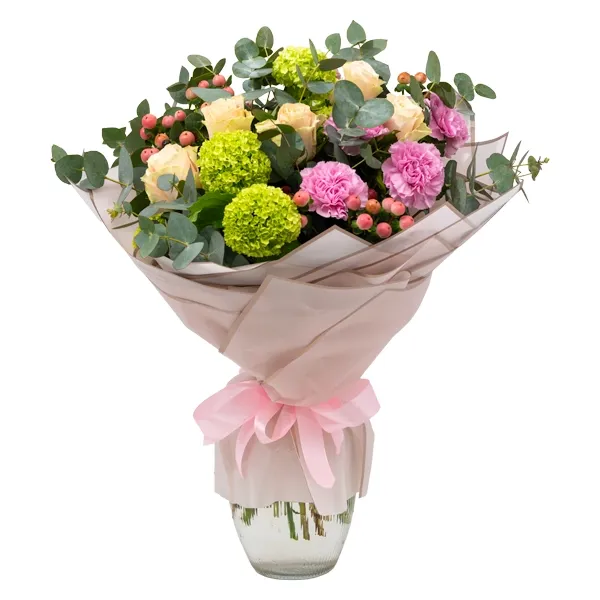Stiilne lillekimp roosidega, milles on ühendatud õrnad roosad ja kreemikad õied koos värske kimburohelisega. Elegantne ja tasakaalustatud lillekimp kingituseks, mis sobib suurepäraselt sünnipäevaks, tänuavalduseks või erilise hetke tähistamiseks. Värsketest lilledest valmistatud kimp, mis toob igasse päeva ilu ja rõõmu.