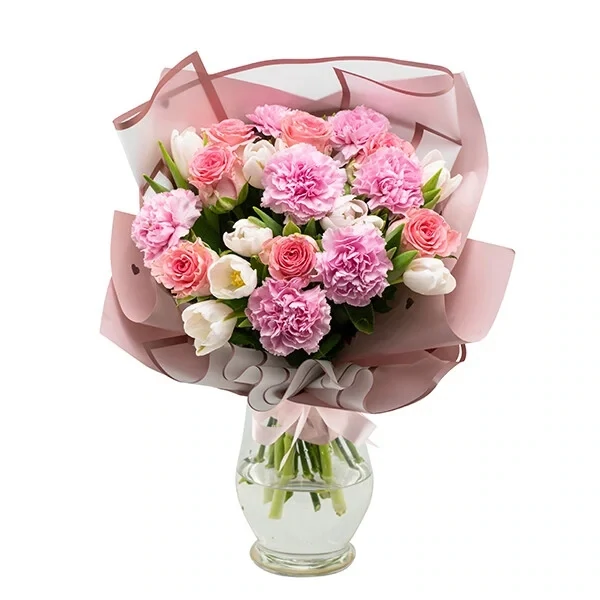 Armsalt seatud ilus ja eriline lillekimp roosadest toonides tulpidest, nelkidest ja roosidest, mis loovad imeilusa harmoonilise koosluse. Imetlusväärne lillekimp igas vanuses saajale igaks tähtpäevaks.