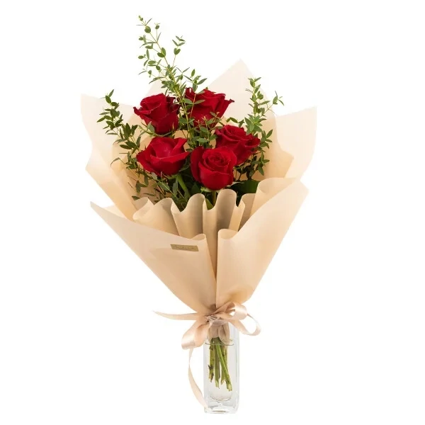 Imeline ja uudne lillekimp punastest roosidest, ilmestatud hoojaalise kimburohelisega. Maitsekas valik, mis sobib kinkimiseks igal tähtpäeval!