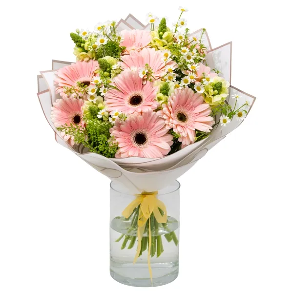 Värske lillekimp gerberatega, milles on ühendatud õrnad roosad gerberad, väikesed lisalilled ja värske kimburoheline. Rõõmus ja helge lillekimp kingituseks, mis sobib suurepäraselt sünnipäevaks, õnnitlemiseks või kellegi päeva kaunimaks muutmiseks. Värsketest lilledest valmistatud kimp, mis toob igasse päeva kergust ja positiivset meeleolu.