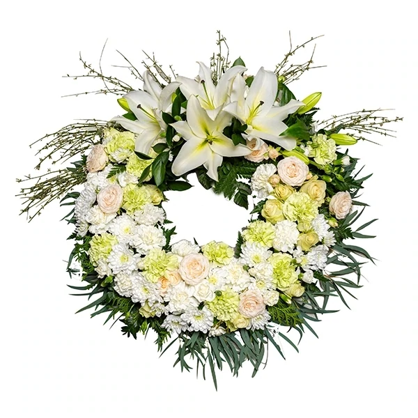 Ringikujuline matuseseade erinevatest valgetest ja beežidest lilledest ning sobivast kimburohelisest.