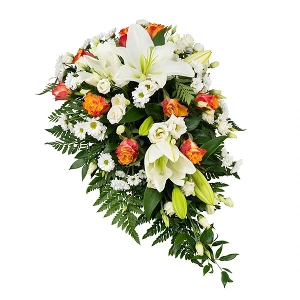 Klassikaline leinaseade valgete ja oranžide lilledega