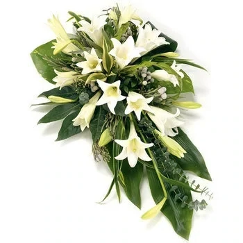 Elegantne matuseseade valgetest liiliatest ja sobivatest rohelistest lehtedest.