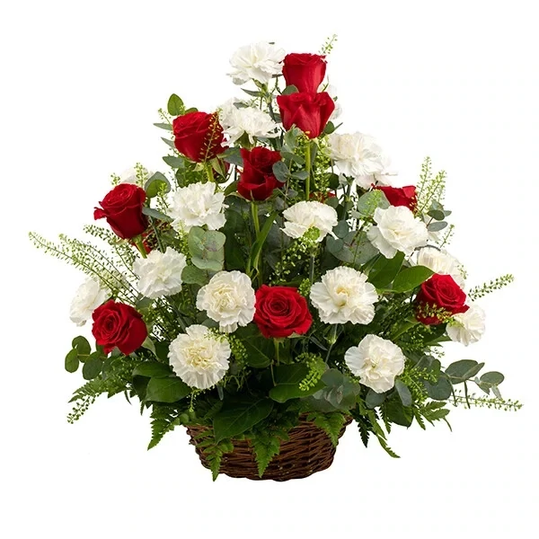 Soliidne ja viisakas nelkidest, kimburohelisest ja punastest roosidest kombineeritud lilleseade kaastunde avaldamise puhuks.