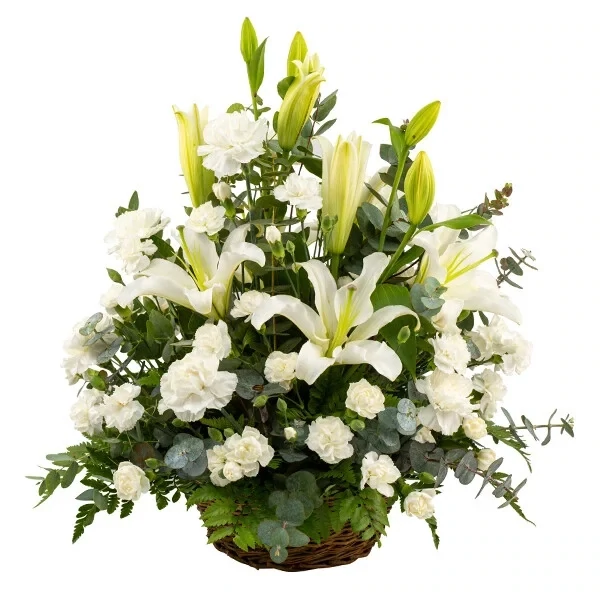 Soliidne ja viisakas valgetest nelkidest ja liiliatest ning kimburohelisest kombineeritud originaalne lilleseade korvis kaastunde avaldamise puhuks.