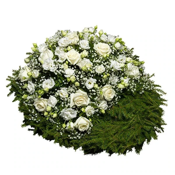 Elegantne ja rohkete lilledega matuseseade koos oskuslikult seatud igihaljastest okstest pärjaga.