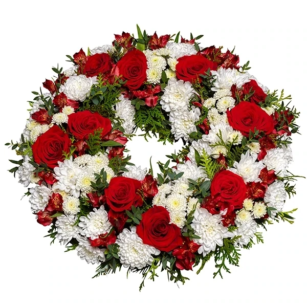 Ringikujuline matuseseade erinevatest valgetest ja punastest lilledest ning sobivast kimburohelisest.
