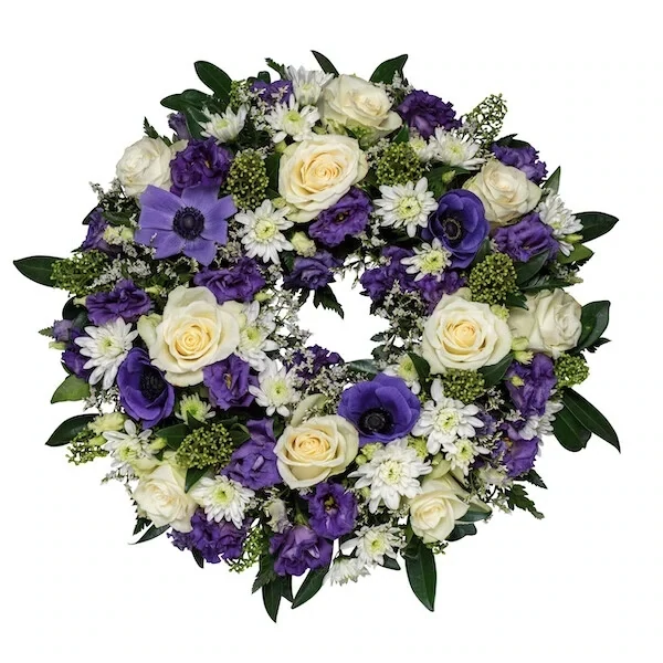 Ringikujuline matuseseade erinevatest valgetest ja lilladest lilledest ning sobivast kimburohelisest.