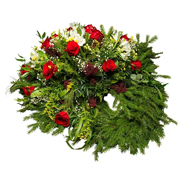 Leinapärg erinevatest valgetest ja punastest lilledest ning sobivast kimburohelisest.