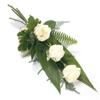 Valgetest roosidest ja sobivast kimburohelisest seatud maitsekas matusekimp.