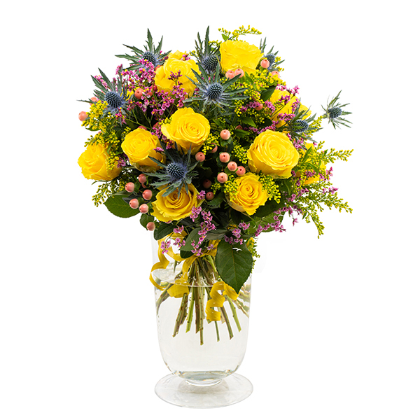 Kaunis värviline ja mitmekülgne lillekimp, mis toob rõõmu ja üllatust iga saaja päeva. 15 säravkollasest roosist koosnev kimp, mida kaunistavad ohakas, solidaago ja teised kaunid õied.