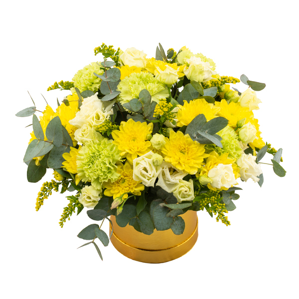 Säravates kollastes toonides trendikas ja armas lillekarp, mis üllatab igat saajat. Karpi on seatud kauapüsivad kollased krüsanteemid, imekaunid preeriakellukesed ja trendikad nelgid. Viimase lihvi annab hooajaline kimburoheline.