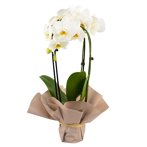 Valge orhidee on pakitud ilupaberisse. Antud taim on suhteliselt vähenõudlik ja on tuntud kui lihtsasti kasvatatav kaunis toataim. Orhidee sümboliseerib vaprust ja elegantsi. Taime pikkus on umbes 50cm.