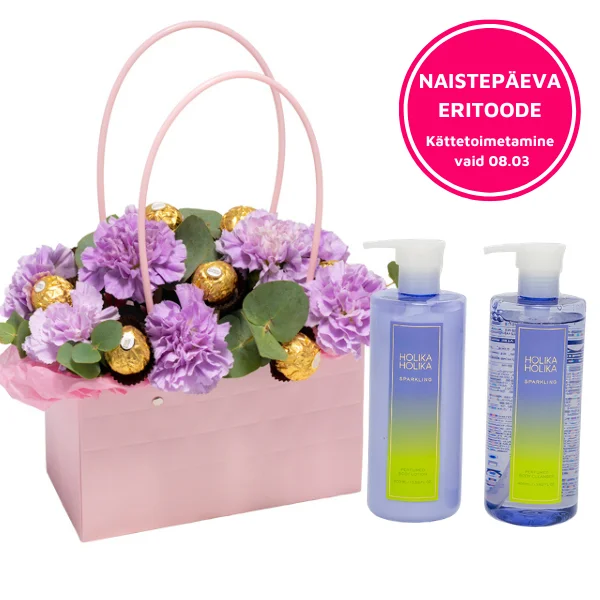 See armas lillekott sisaldab imelisi lillasi nelke ja mõnusalt magusaid Ferrero Rocher komme. Lillekotile on lisatud hoolitsevad kehahooldustooted HolikaHolikalt (www.holikaholika.ee). Komplekti kuulub dušigeel Perfumed Body Cleanser - Blooming ja ihupiim Perfumed Body Lotion - Blooming. See on eriline ja armas kingitus suurepärasele kaaslasele!