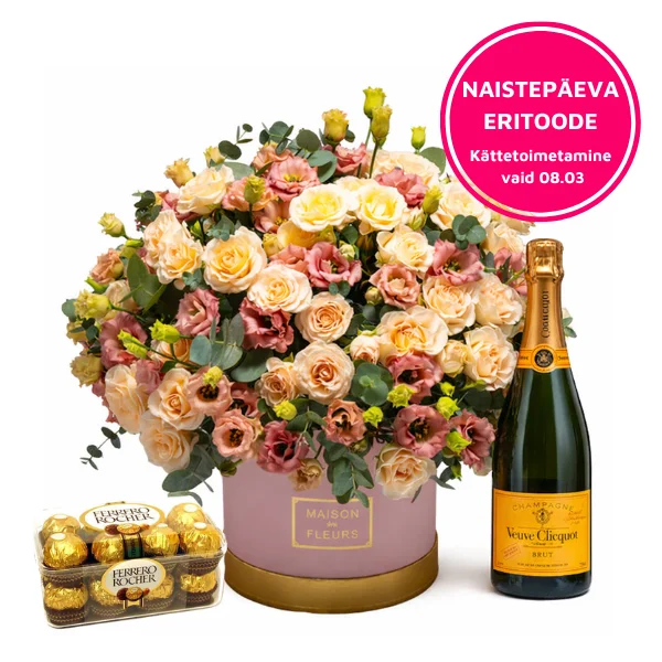 See luksuslik roosidest kombineeritud lillekarp on eriline ja luksuslik kingitus suurepärasele kaaslasele! Karbile on lisatud imeline šampanjade kuninganna Veuve Clicquot, mis pakub maitsemeelele kõrgetasemelist ja luksuslikku janukustutust. Lillekarbile on lisatud mõnusalt magusad Ferrero Rocher kommid, mis muudavad kingituse täiuslikuks. Eriline lilleüllatus kõige kallimale.