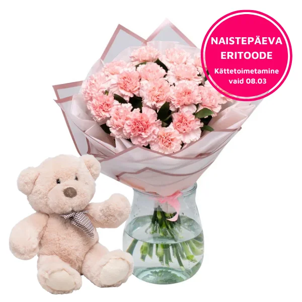 Kaunis lillekimp roosadest nelkidest on armas kingitus igaks tähtpäevaks. Kimbule on lisatud ilupaber, mis loob lilledele kauni raami. Kimbule on lisatud ka armas kaisukaru, et muuta kingitus eriti meeldejäävaks.