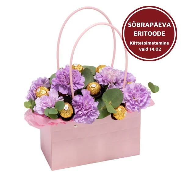 See armas lillekott sisaldab imelisi lillasid nelke ja magusaid Ferrero Rocher komme. See on eriline ja magus kingitus suurepärasele kaaslasele!