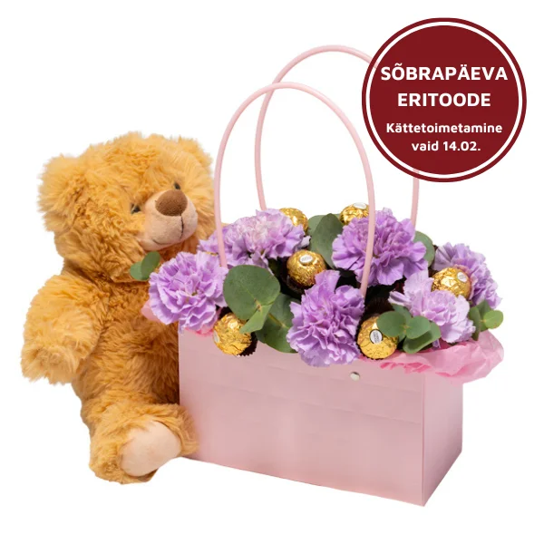 See armas lillekott sisaldab imelisi lillasid nelke ja magusaid Ferrero Rocher komme. Lillekotile on lisatud nunnu kaisukaru. See on eriline ja magus kingitus suurepärasele kaaslasele!
