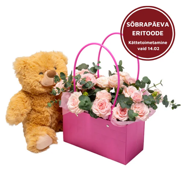 See armas lillekott sisaldab imelisi roosasid roose ja kaunist eukalüpti. Lillekotile on lisatud nunnu kaisukaru. See on eriline ja armas kingitus suurepärasele kaaslasele!