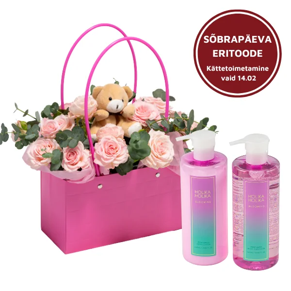 See armas lillekott sisaldab imelisi roosasid roose ja nunnut kaisukaru. Lillekotile on lisatud hoolitsevad kehahooldustooted HolikaHolikalt (www.holikaholika.ee). Komplekti kuulub dušigeel Perfumed Body Cleanser - Blooming ja ihupiim Perfumed Body Lotion - Blooming. See on eriline ja armas kingitus suurepärasele kaaslasele!