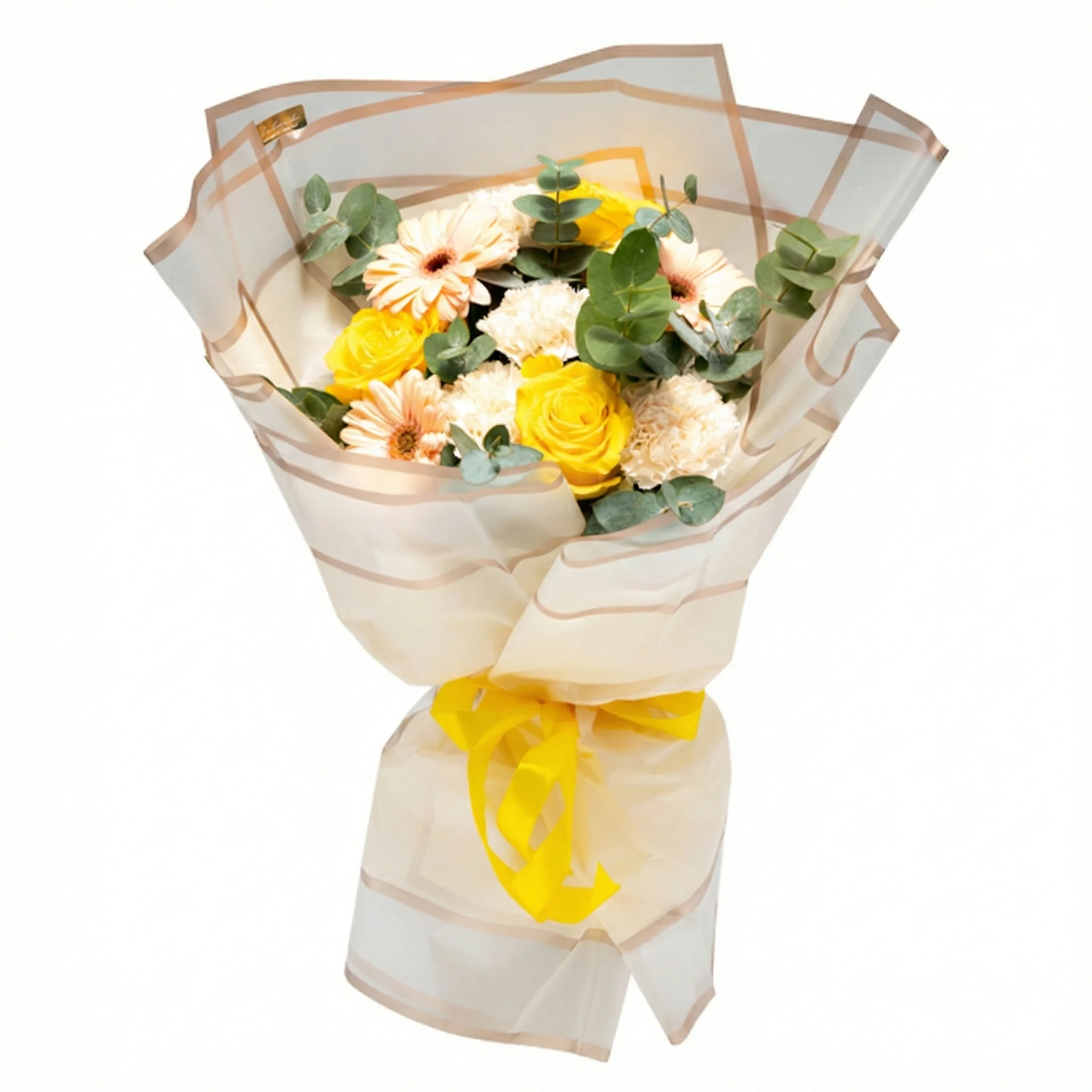Selles kimbus kohtuvad heledalt helkivad õied koos kollaste roosidega. Kimpu raamib uhkelt seatud kimbupaber ja lopsakas eukalüpt. Ideaalne lillekimp igaks tähtpäevaks.