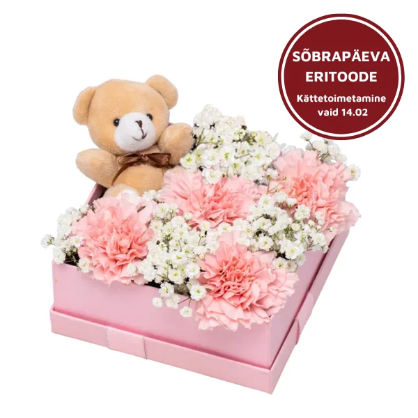 See armas karp sisaldab imelisi roosasid nelke ja imearmast karumõmmit- eriline ja hellitav kingitus suurepärasele naisele!