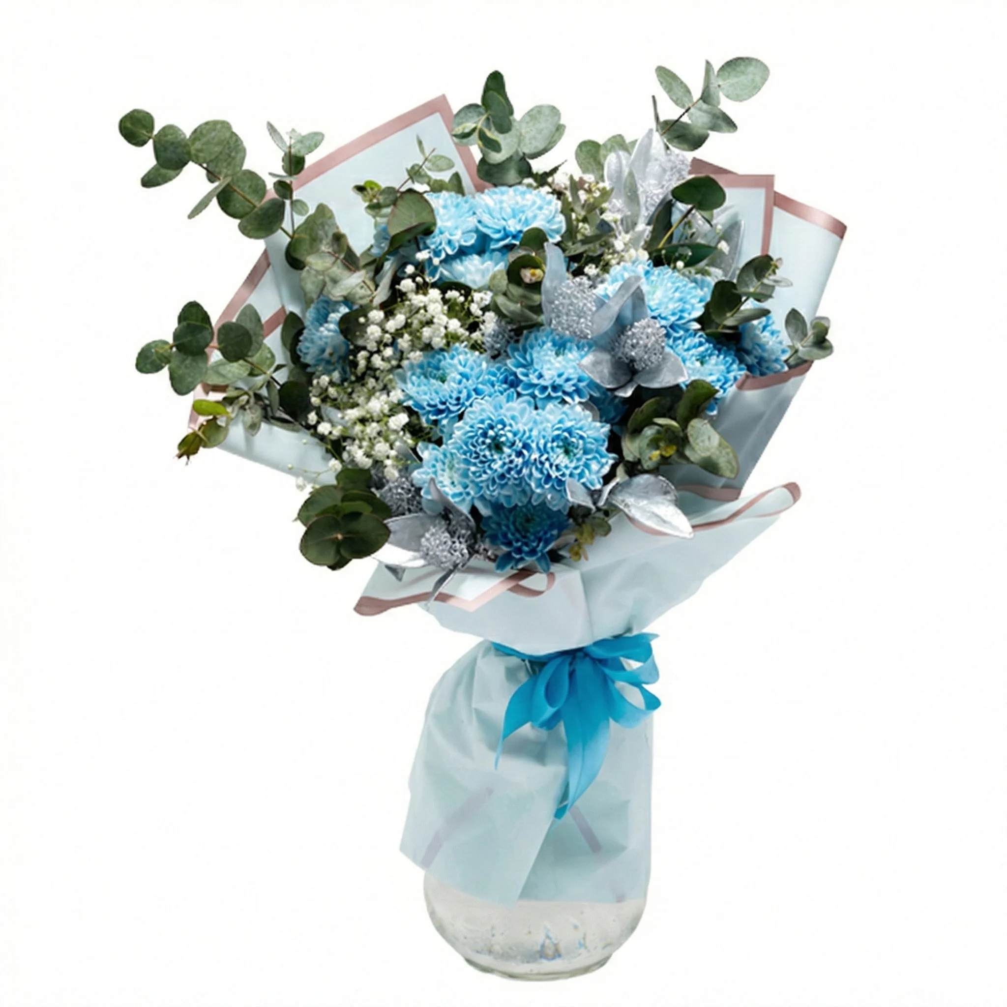 Kaunis helesinistes toonides lillekimp, mida raamib kaunis eukalüpt, õrn kipslill ja luksuslikult seatud kimbupaber. Armas kingitus igaks tähtpäevaks.
