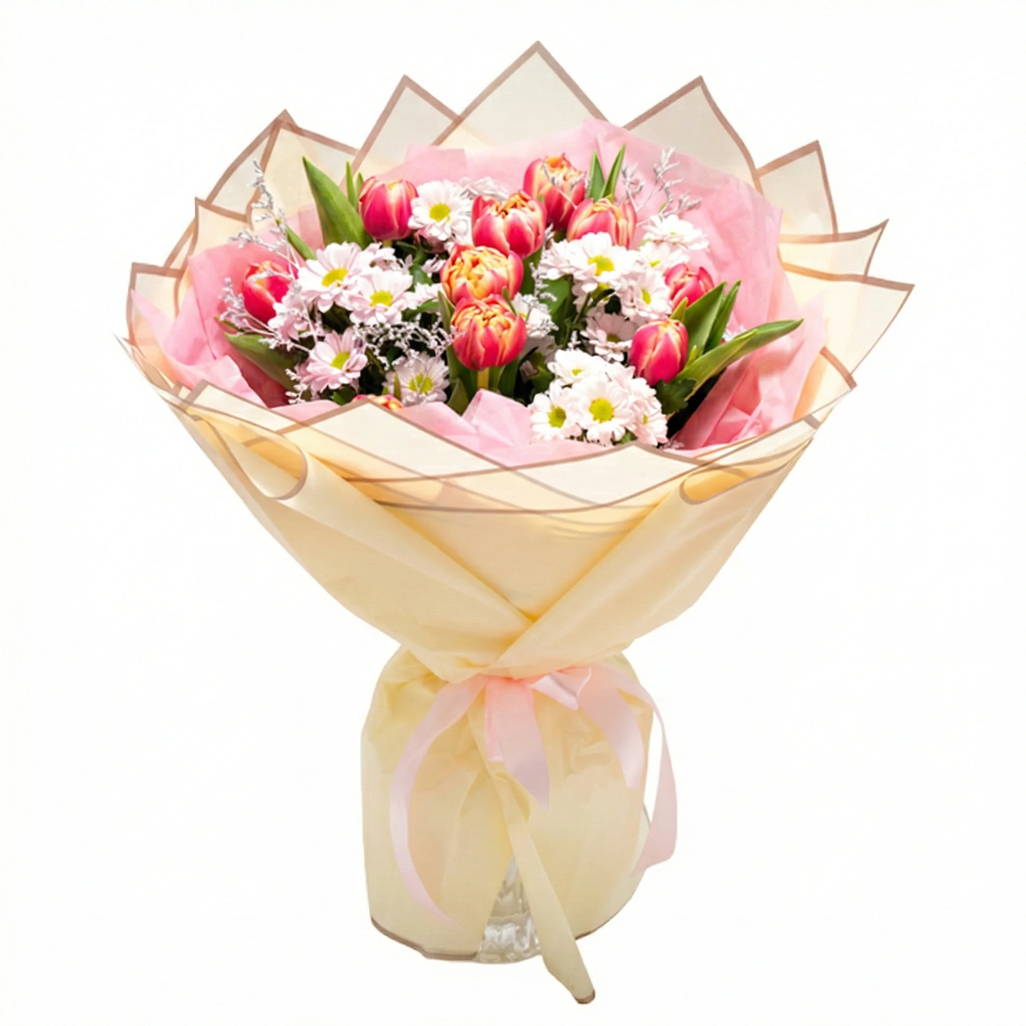 Kaunitest roosades toonides kevadine lillekimp koosneb hoolikalt valitud kevadistest tulpidest ja õrnadest oksakrüsanteemidest. Kimpu raamib uhkelt seatud kimbupaber. Armas ja kevadine lillekimp igale saajale.