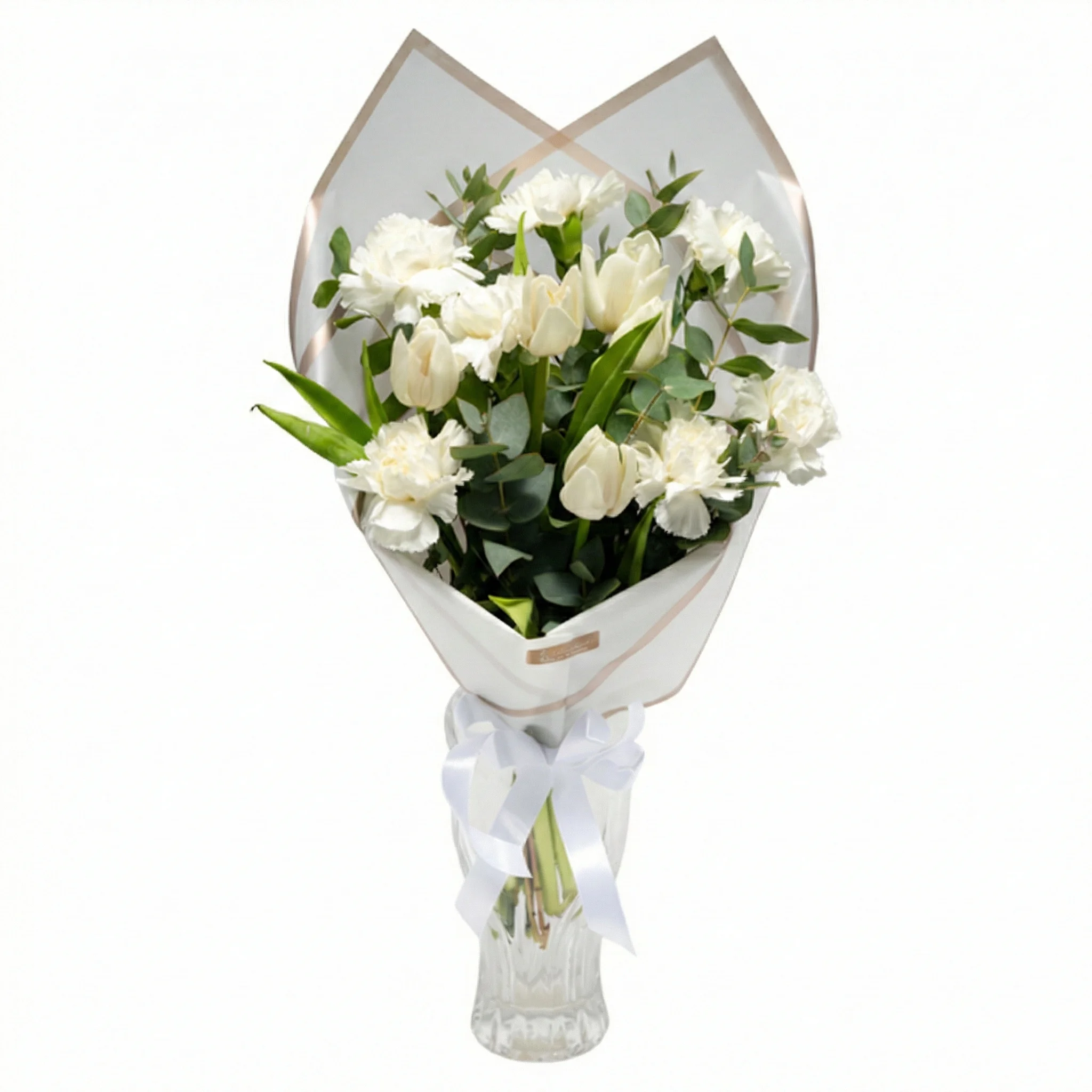 Helgetest valgetest tulpidest ja nelkidest seatud valge lillekimp on kui lumine kingitus, mis sobib igaks võimalikuks sündmuseks. Lihtne ja kaunis kingitus või sisustuselement interjööri kaunistamiseks.