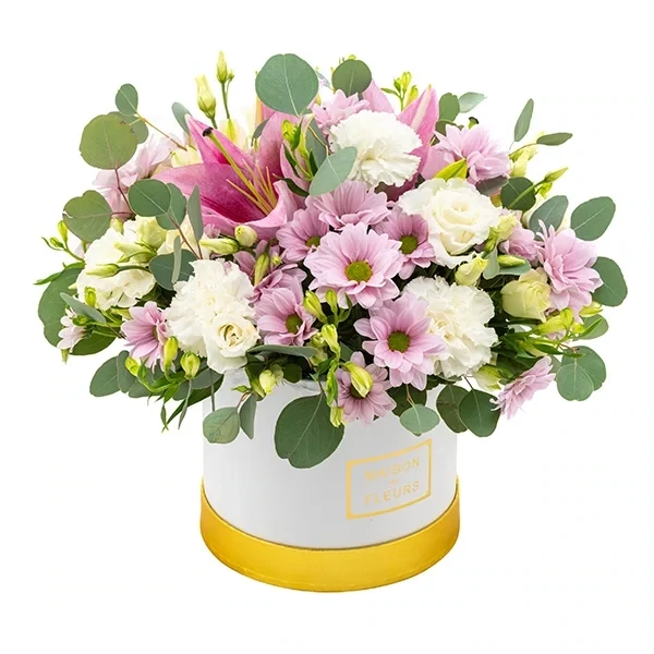 Meeldivates heledates ja roosaakates toonides naiselik ja õrn lillekarp, mis sobib kinkimiseks igaks tähtpäevaks.
