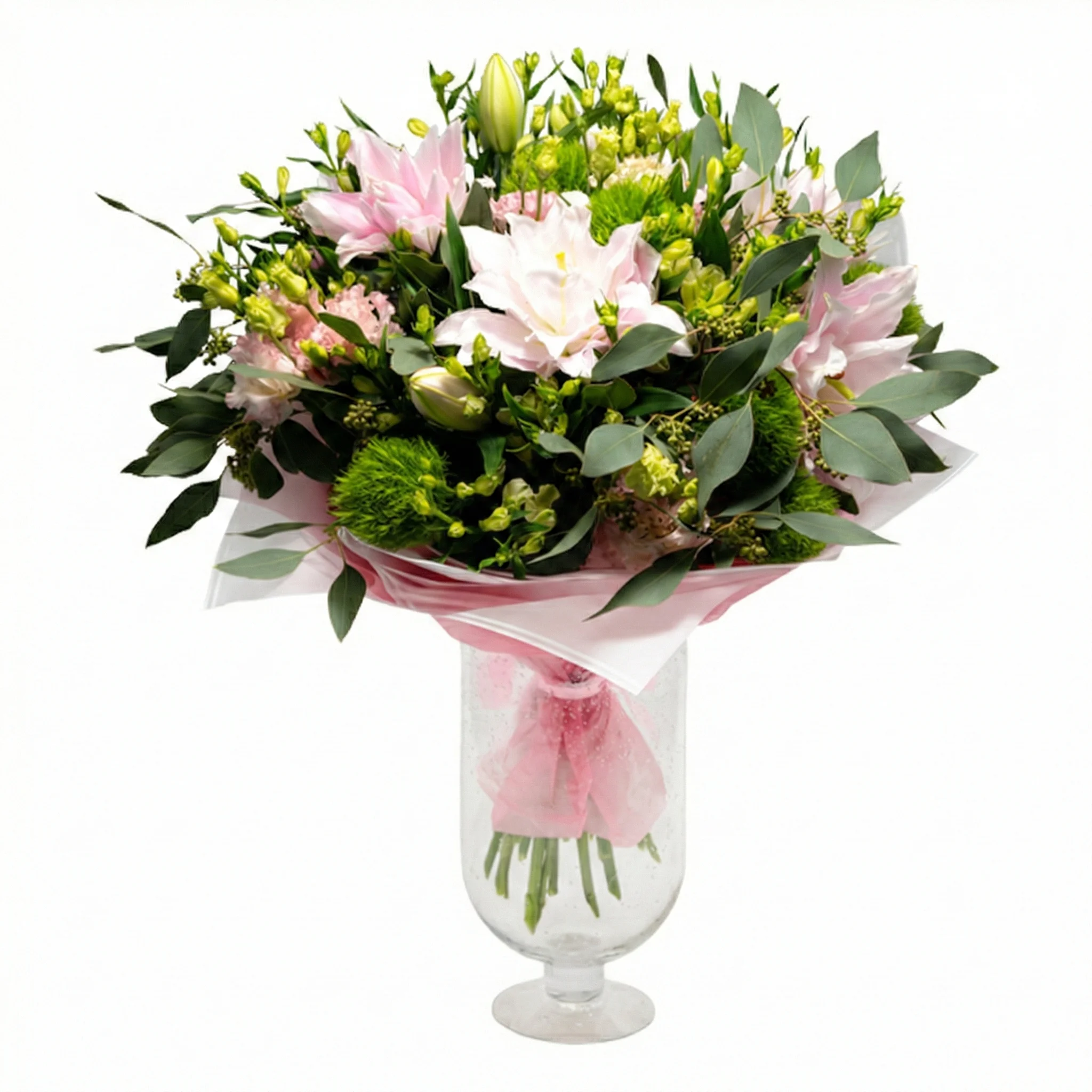 Õrnadest roosadest liiliatest ja preeriakellukestest seatud lillekimp on kaunis ja meeldejääv kingitus igaks tähtpäevaks. Dekoratiivpaber ja pael annavad kimbule kauni raami. Õrn ja lopsakas kingitus kõige kallimale.