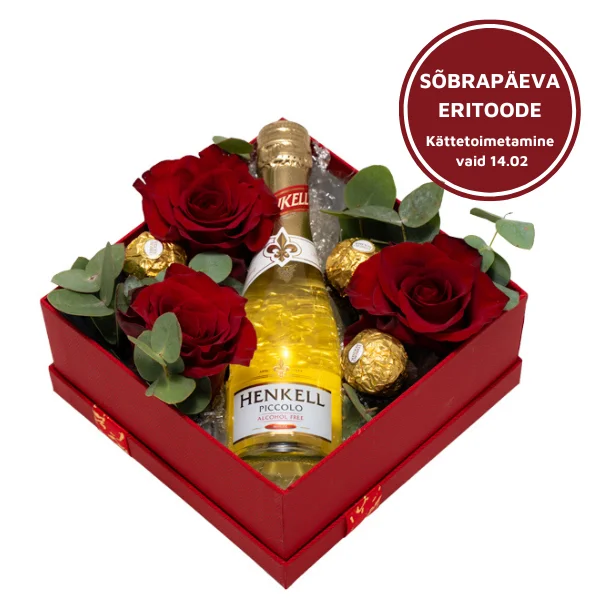 See luksuslik karp sisaldab imelisi punaseid roose ja mõnusalt magusaid Ferrero Rocher komme. Lillekarbi südameks on kosutav ja värskendav vahuvein. Mõnusalt tasakaalus kingitus kõige kallimale.