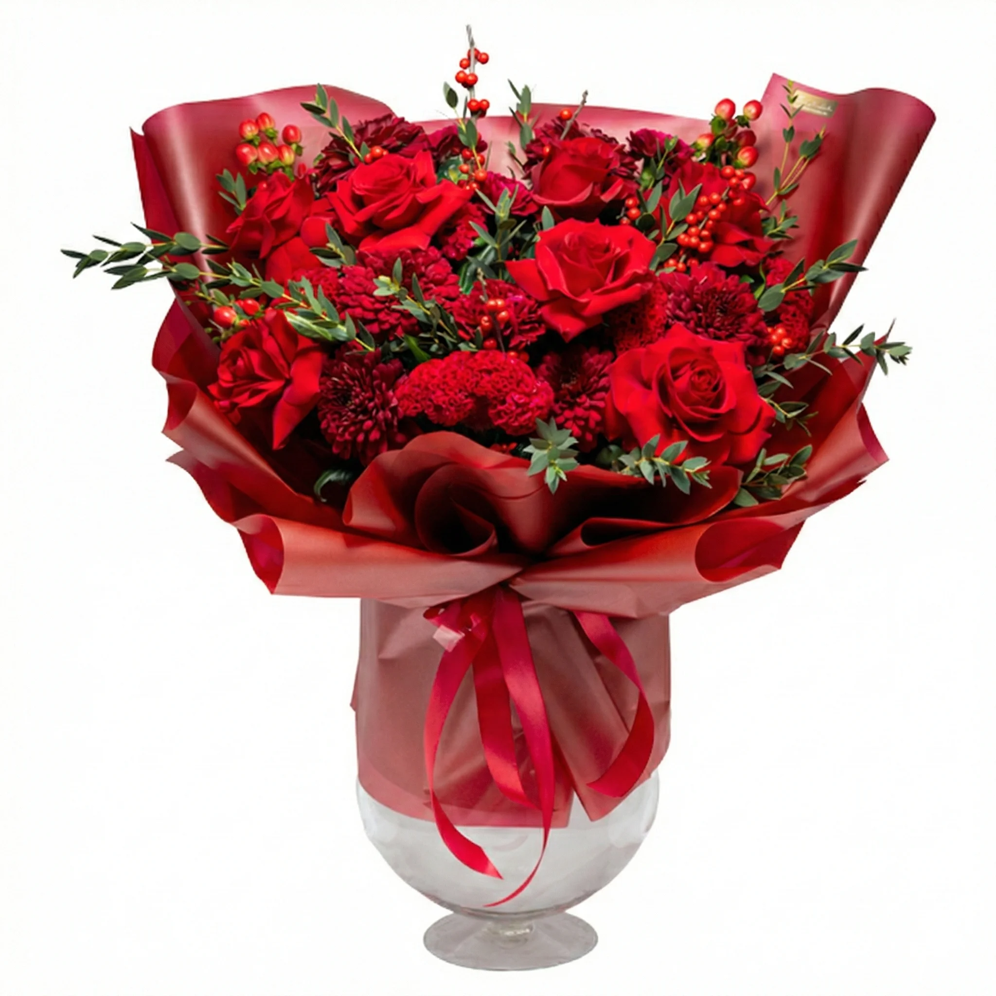 Sügavpunastes toonides luksuslik lillekimp on suurepärane kingitus üllatamaks kõige kallimaid. Lillede ilu raamib kaunis eukalüpt ja uhkelt seatud kimbupaber. Luksuslik lillekimp, mis sobib kinkimiseks igaks tähtpäevaks.