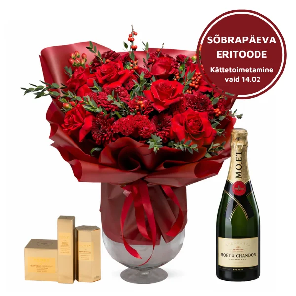 See sügavpunastes toonides lillekimp on eriline ja armastust täis kingitus suurepärasele kaaslasele! Kimbule on lisatud imeline šampanja Moët & Chandon, mis pakub maitsemeelele kõrgetasemelist ja luksuslikku janukustutust. Lisaks teeb kinkekomplekti täiuslikuks näohooldustooted HolikaHolikalt (www.holikaholika.ee). Komplekti kuulub näokreem Honey Royalactin Glow Cream, silmakreem Honey Royalactin Intensive Eye Cream ja seerum Honey Royalactin Propolis Ampoule. Suursugune ja rikkalik kingitus kõige kallimale.