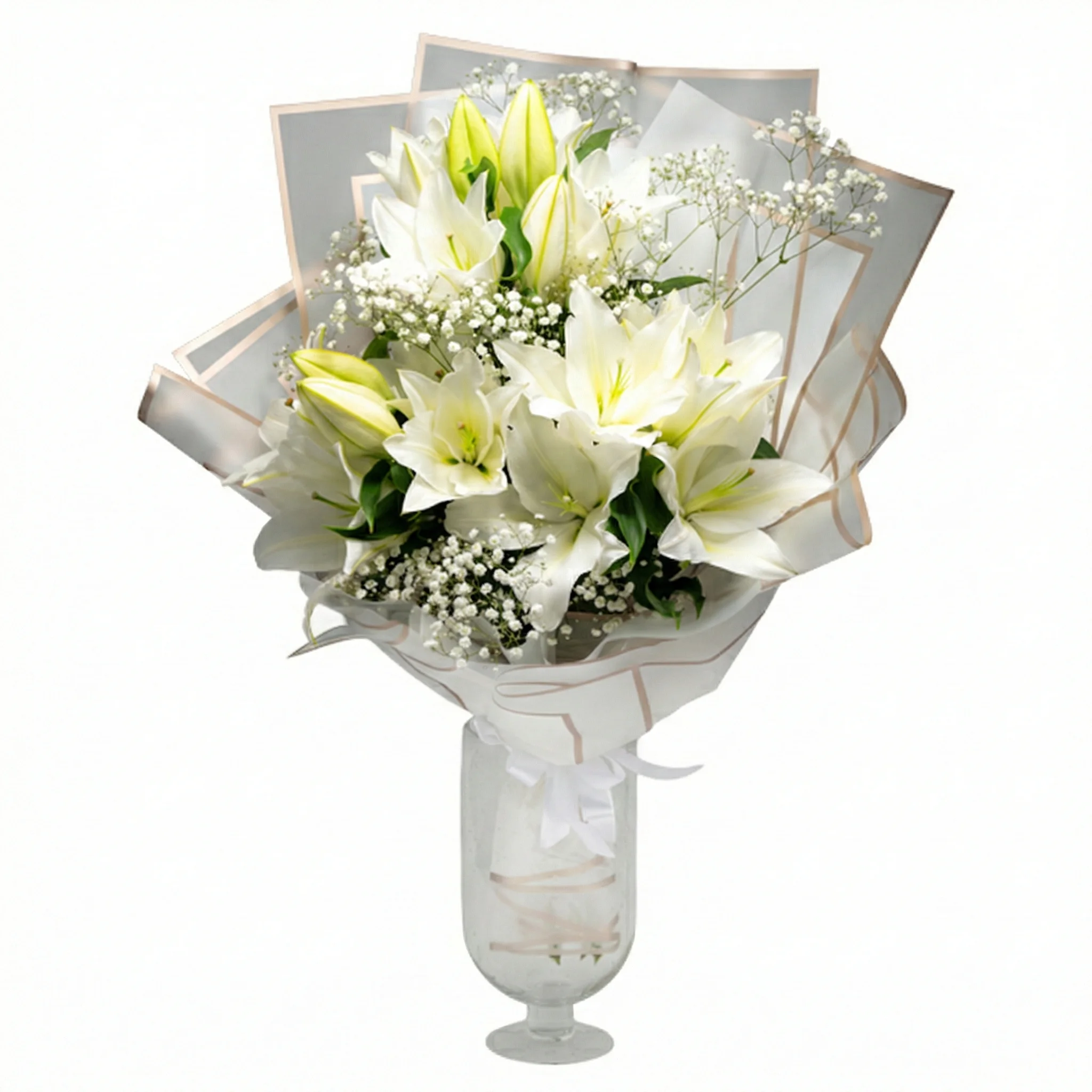 See valgetest liiliatest lillekimp on armas ja eriline kingitus igaks tähtpäevaks. Kimbule on lisatud uhke ilupaber, mis loob lilledele kauni raami.