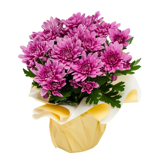 Krüsanteem rõõmustab oma tihedate, värvikate õitega ja pika õitsemisajaga. See sügise lemmiklill sümboliseerib rõõmu, tänulikkust ja headust. Taim on pakitud kaunisse ilupaberisse ning selle kõrgus on umbes 25 cm. Lihtne hooldada ja sobib suurepäraselt nii tuppa kui rõdule – krüsanteem toob rõõmu pikaks ajaks!